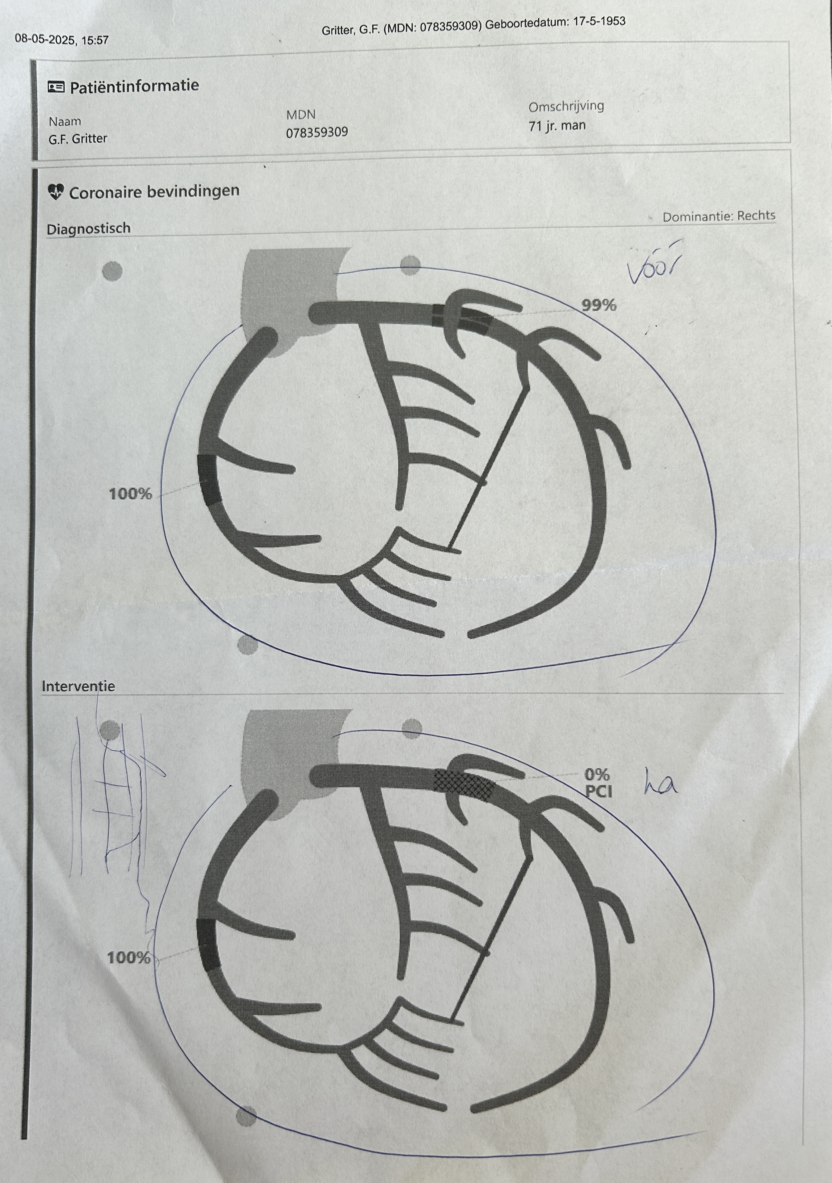 Infarct: Vorige keer vertelde ik al over de onwil van de cardioloog om mijn hartprobleem te bekijken. Via een nieuw toegewezen cardioloog kreeg ik een extra pilletje waarmee het wel opgelost zou worden. Niet dus. Ik zat op dinsdagavond 6 mei rustig tv te kijken toen ik enorme kramp in mijn linkerarm kreeg. Had ik wel eerder al gehad, maar dan trok het weer weg. Dit keer echter niet. Joyce kwam aangerend met mijn puffertje met nitroglycerine. Drie pufjes onder de tong verder, gebeurde er nog niks. Dan maar 112 bellen en niet veel later kwam een ambulance met gillende sirene onze straat ingereden. Altijd leuk voor de buren in de nachtelijke stilte. Apparatuur aansluiten en met spoed naar het Spaarne ziekenhuis in Haarlem. Een vierde pufje in de ambulance bracht gelukkig wel opluchting. Die nacht werd er verder onderzoek gedaan via het bloed. Bij een hartinfarct komt er een bepaald enzym vrij in je bloed. Wanneer de hoeveelheid van dat enzym bij volgende bloedafnames toeneemt, dan weet men zeker dat het een infarct is. Dat bleek bij mij zo te zijn. De volgende dag lag ik op de hartbewaking en kon ik een beetje bijkomen van mijn nachtelijke avonturen en slaaptekort. Voor de donderdagochtend stond een rit per ambulance naar het Onze Lieve Vrouwen Gasthuis Oost in Amsterdam op het programma. Daar wachtte mij een katherisatie. Dat laatste kon ook wel in het Spaarne, maar dotteren en een stent plaatsen kon daar niet. Dus was het OLVG de beste optie. Gezellig kletsend met een ambulancebroeder die naast dat werk ook makelaar was (bijzondere combinatie), bespraken wij onze zoektocht naar een levensloop bestendige woning. Het hartcentrum van het OLVG bleek gevestigd in een gezellige ronde loungeruimte. Bureaus in het midden, een stuk of tien hokjes met bedden langs de wand en een soort huiskamer er tegenover. Bijna leuk als het niet zo ernstig was. Elk hokje werd bewoond door een patiënt die net gedotterd was. Mijn voorland dus. Na wat administratieve dingetjes werd ik opgehaald voor de ingreep. Mijn pols werd verdoofd terwijl ik op een operatietafel lag. Daar zou de katheder ingevoerd worden in een slagader. Ik kon meekijken op een groot scherm en vragen stellen aan de cardioloog. Toen ik hem vroeg hoe lang de katheder er over zou doen om van mijn pols naar mijn hart te komen, was het antwoord ’10 seconden’. Kennelijk één rechte snelweg zonder ingewikkelde bochten en afslagen. Ik voelde er verder niks van. Het kan voorkomen dat je slagader samentrekt door de katheder en dat er pijnlijke weerstand optreedt, maar bij mij gelukkig niet. Ook het dotteren van de afgesloten kransslagader merkte ik niks van. Het opblazen van het dotter ballonnetje geeft vaak het gevoel dat vergelijkbaar is met een infarct, maar ook dat bleef uit. Vervolgens werd een stent geplaatst. Een buisje van roestvrij staal gaas. Tijdens het katheteriseren bleek dat ook een tweede kransslagader verstopt zat. Ik had dus al eerder een zogenaamd ‘stil-infarct’ gehad. Waarschijnlijk was dat in december toen ik ook met spoed was opgenomen. Toen echter had het hartfilmpje niks aangetoond. Wel was ik sinds die tijd erg moe en dat is een symptoom van een stil infarct. Die tweede verstopping kon niet meteen verholpen worden. De 5 juni ga ik dus op herhaling. Dan wordt er vanuit lies en pols gekatheteriseerd. Bijzonder was wel dat mijn hart vanuit de kransslagader die nu was geopend (na het stil infarct in december) zelf een by-pass had gemaakt naar die verstopte kransslagader. Dat komt in zeldzame gevallen voor. Joyce riep later: “Wat heb jij toch een bijzonder sterk lichaam”. Daardoor had ik er, behalve wat vermoeidheid, de afgelopen maanden weinig van gemerkt. Na de uitleg van de ingreep met filmbeeld werd nog even de klemband om mijn pols gecontroleerd. Jammer genoeg werd de klem per ongeluk wat losser gemaakt, waardoor er een enorme onderhuidse bloedbobbel verscheen. Gevolg een gezwollen zwarte hand en een bloeduitstorting tot voorbij mij elleboog. Daardoor vier uur met een armklem en drukverband platliggen. Alsof arm en hand op het punt staan uit elkaar te spatten. Brrrr. De ambulance die mij zou terugbrengen liet op zich wachten en arriveerde pas om half tien ’s avonds. Te laat om de aansluitend geplande nierdialyse nog te doen. (contrastvloeistof zo snel mogelijk verwijderen om verdere nierschade te voorkomen). Dat gebeurde daarom de volgende morgen vroeg en toen mocht ik alweer naar huis. Ik moest nog even denken aan mijn moeder die jaren geleden tot twee keer toe door een infarct werd getroffen. Toen nog geen stent maar een open hart operatie en het plaatsen van meerdere aderen als bypass. Herstel in toevallig ook in het OLVG duurde een paar weken. Ik ging gewoon een dag later naar huis alsof er niks gebeurd was. Bijzonder. Het enige is dat ik een paar weken de arm moest ontzien en vier weken geen auto mag rijden. Mijn andere arm mocht ik vanwege de dialyse-shunt al niet belasten, dus dat waren een paar rustige weken. (ha, ha) En…om de stent te laten ingroeien moet ik een jaar lang een pil slikken die het stollen van mijn bloed verhinderd. Erg lastig wanneer je een wondje hebt, merkte ik daarna. Dat blijft gewoon twee dagen bloeden.