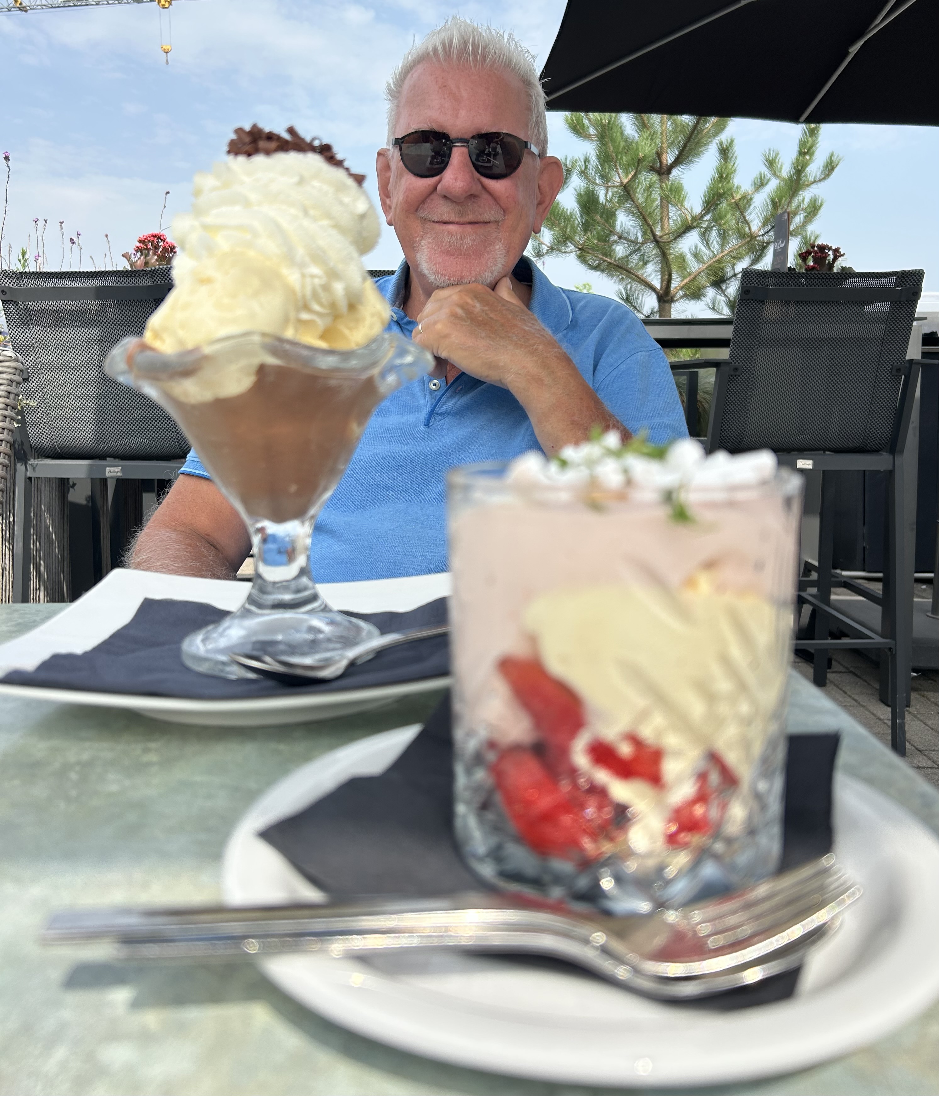 Joop 68 jaar: Afgelopen 15 augustus tikte Joyce de 68 kaarsjes aan. Gebruikelijk is bij onze verjaardagen een ‘belevenisdag’ i.p.v. een kringverjaardag. Ging mijn belevenis verjaardag dit jaar niet door vanwege mijn hartinfarct, die van Joyce verviel door de knieoperatie. Na het Skydiven vorig jaar was (en is) de gewenste belevenis dit jaar een ‘Paramotor vlucht’. Dat is vliegen met een motortje onderaan een parachute. Maar met een stijve knie natuurlijk op dit moment niet erg verstandig. Het vliegseizoen loopt tot oktober, dus maar uitstellen tot volgend voorjaar. Dit jaar weer een gewone verjaardag in kleine kring. Wel ’s middags samen een gezellig terras opgezocht aan het water voor een lekker grote ijscoupe. Jasper stuurde en persoonlijke kaart met allerlei lieve gedachten over zijn moeder en enkele QR-codes met haar favoriete muzieknummers. Die werden dus luidkeels meegezongen in de tuin.