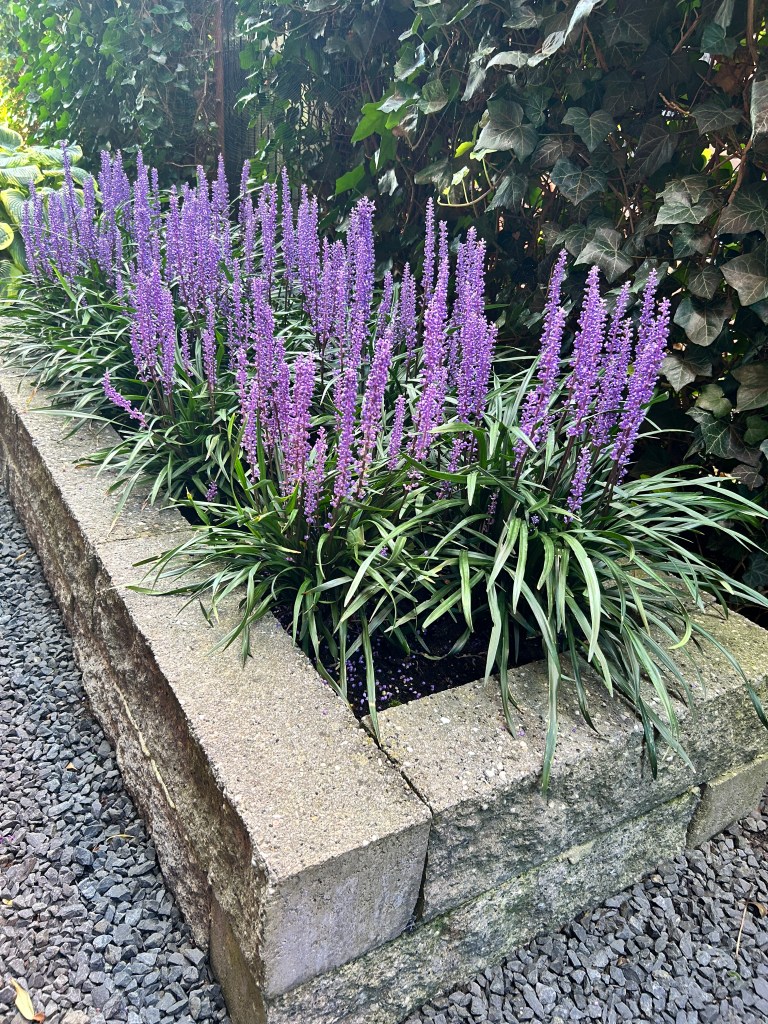 Liriope: Onze border met Liriope of Leliegras staat prachtig in bloei. De lange paarse pluimen zijn een lust voor het oog. Liriope is een geslacht uit de aspergefamilie en bloeit van de late zomer tot en met oktober.